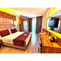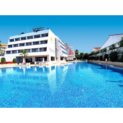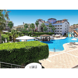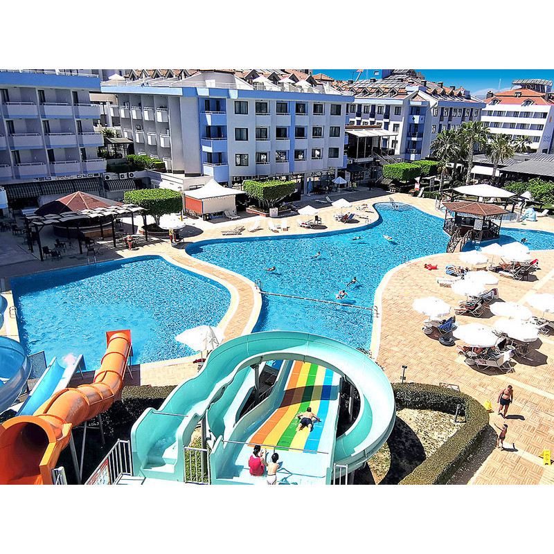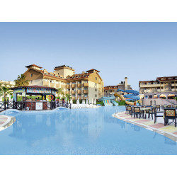 Ausstattung: Aus mehreren Gebäuden bestehende Hotelanlage der guten Mittelklasse. Garten, 2 Pools, 4 Wasserrutschen (stdw.), Pool-/ Snack-/Strandbar, Sonnenterr., Liegen, Schirme (Badetücher geg. Geb.). Rezeption, WLAN (Rezeption inkl.; restl. Anlage geg. Geb.), Lobbybar, Restaurant, À-la-carte-Fischrestaurant am Strand (wetterabh., ab ca. 15.05.), Geschäfte, Friseur, Amphitheater, TV-Raum, Diskothek, Hallenbad. Landeskat.: 5 St., 389 Zi., 4-5 Etg., 7 Lifte.