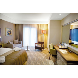 Die komfortablen sowie modernen Deluxe Doppelzimmer sind etwa 20 qm groß und liegen im Haupthaus. Sie verfügen über ein Bad mit Dusche und Föhn Außerdem gibt es auf den Zimmern einen Kaffee-/Teezubereiter, einen Satelliten-TV mit deutschen TV-Kanälen, ein Telefon und einen Balkon oder eine Terasse. WLAN ist inkludiert. Außerdem stehen ein Laptopsafe, eine Minibar und Zimmerservice gegen Gebühr zu Verfügung. Eine zentral gesteuerte Klimaanlage und Heizung gibt es.