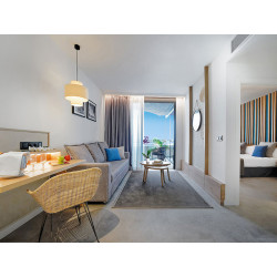 Juniorsuite (JS, ca. 43 qm, adults only), Klima, Wohn-/Schlafraum, TV, WLAN, Mietsafe. Dusche/WC. Balkon mit Meerblick. Max. 3E