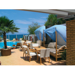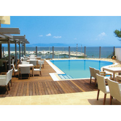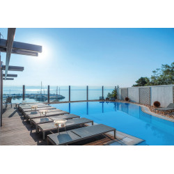 MARINA SUITEN: (ua) Lage im 2. Stock. Grundausstattung wie die Zimmer, jedoch größer und mit 3 Panoramafenstern. Bad/WC, Föhn. Großer Balkon mit Meerblick.
