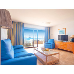 Wohnen: Appartement Typ B (APU, ca. 40 qm), Wohnraum, sep. Schlafzi. Kitchenette, TV, Telefon, Mietsafe, WLAN (geg. Geb.), Bad/WC. Balkon/Terrasse. Max. 3E/2E+2K, zur Alleinnutzung buchbar. (ABE) Wahlweise auch als ein im Jahr 2019 renoviertes Superior-Plus-Appartement mit Klimaanlage und Poolblick buchbar. (APS) 3E/2E+2K.