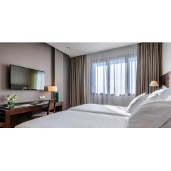 Ausstattung: Das 2017 zuletzt teilrenovierte Stadthotel verfügt über insgesamt 141 Zimmer. Es ist ausgestattet mit einer 24 h geöffneten Rezeption, einer Lobby mit Bar, 3 Liften, einer Klimaanlage, einem Safe (gegen Gebühr), einem Parkplatz (gegen Gebühr) sowie einem Security Entry System. Einen ereignisreichen Tag können Sie an der Hotelbar ausklingen lassen. Wi-Fi steht den Hotelgästen kostenlos zur Verfügung.