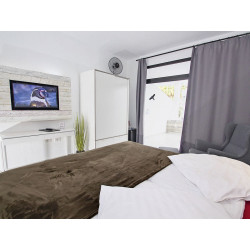 Doppelzimmer Typ B (DZ, ca. 26 qm), Schlafsofa, TV (40 Zoll), WLAN (geg. Geb.), Mietsafe, Minibar (geg. Geb.). DU/WC. BK/TE mit Hängematte. Max. 3E/2E+2K, zur Alleinnutzung buchbar. (EZ)