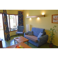 Bungalows: Die geschmackvoll eingerichteten und teilmodernisierten Bungalows verfügen über einen Wohnraum mit Kitchenette mit Microwelle, Toaster, Wasserkocher und großer Kühl-/Gefrierkombination, Flatscreen-Sat.-TV, Mietsafe (gegen Gebühr), Ventilator (gegen Gebühr), Duschbad (ebenerdiger Zugang) /WC, separates Schlafzimmer mit großem Doppelbett mit Kissenmenü sowie möblierter Terrasse.