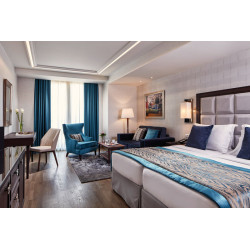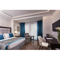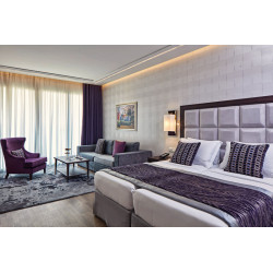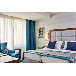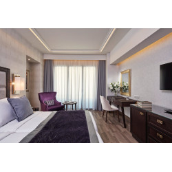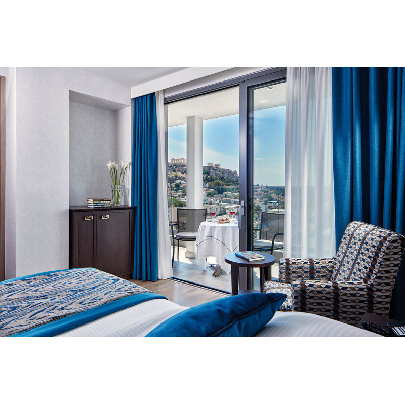 DELUXE AKROPOLIS ZIMMER: (re) Ca. 18-21 qm. Grundausstattung wie die Classic Zimmer. Marmorbad/WC, Föhn, Bademantel, Slipper, Korres Pflegeprodukte. Balkon mit Blick auf die Akropolis.