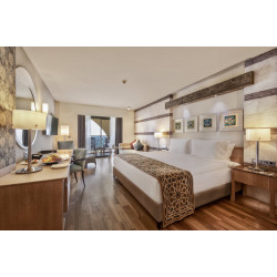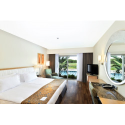 ZIMMER: Einzel- und Doppelzimmer Superior sind freundlich eingerichtet und ausgestattet mit Bad/ Dusche/WC, komfortabler Sitzecke Föhn, Direktwahltelefon, Voice-Mail, Sat-TV, Schreibtisch, Safe, Minibar, Klimaanlage, Parkettboden und Balkon, zur Land- zum Golfplatz- oder seitl. Meerseite buchbar. Dreibettzimmer sind Doppelzimmer mit Zustellbett (Zustellbett ist nur für Kinder möglich). Zimmer Deluxe haben die gleiche Ausstattung wie Superior Zimmer, sind jedoch zur Meerseite gelegen. Junior Suiten verfügen über ein Schlafzimmer (Kingsize Bett) und einen getrennten Wohnraum, zur Meerseite. Ein-Zimmer Suiten bestehen aus einem Wohn- und einem Schlafzimmer mit Verbindungstür und extra WC, wahlweise zur Golf- oder Meerseite buchbar. Familienzimmer sind im Hauptgebäude verfügen über 2 Schlafräume mit Verbindungstür(1 Zimmer mit Kingsize-Bett, 1 Zimmer mit zwei Einzelbetten) und komfortable Sitzecke. Royal Golf Villen sind geräumiger als die Familienzimmer und verfügen über zwei Schlafzimmern, zwei Bäder Wohnbereich mit Sitzecke, Küchenzeile, mit direktem Zugang von der Terrasse zum Pool.