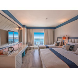 Familienzimmer (FZ, ca. 38 qm), 2 Schlafzimmer mit Verbindungstür, Klimaanlage (zentral), Telefon, Minibar, TV, Safe. Bad/Dusche, WC, Föhn. Balkon, seitlicher Meerblick. Max. 4E+1K