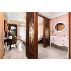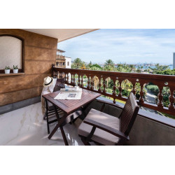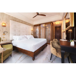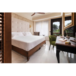 Doppelzimmer Deluxe: Die Zimmer ca. 23 m² sind elegant und mit exklusivem Mobiliar eingerichtet und verfügen über eine Klimaanlage (individuell regulierbar), Deckenventilator, Safe, Minibar (leer, Auffüllung gegen Gebühr), Kaffee-/Teezubereiter, Wi-Fi, Smart-TV, Badezimmer mit Dusche/WC, Föhn (teilweise offenes Badezimmer) sowie Bademantel, Hausschuhe, teilweise mit Balkon oder Terrasse.