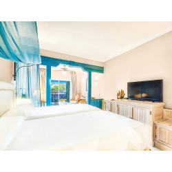 Wohnen: Doppelzimmer (DZ, ca. 38 qm), Klimaanlage, Deckenventilator, Sitzecke, TV, WLAN, Minibar, Safe. Bad/Dusche, WC, Föhn. Balkon/Terrasse mit Gartenblick, wahlweise mit Meerblick (DZM) Max. 3E, zur Alleinnutzung (EZ, EZM) oder als Familienzimmer (FZ, Min./Max. 2E+2K) buchbar.