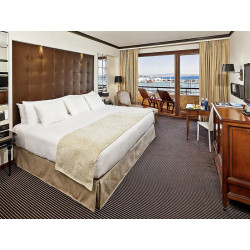 Premium-Zimmer 'Red Level' (DPM, ca. 37 qm), komplett renoviert, Klimaanlage (w./k., zentral gesteuert), TV (37 Zoll), Telefon, WLAN (inkl.), Safe (inkl.), Minibar. Bad/Dusche, Föhn, Bademäntel, Slipper, hochwertige Pflegeprodukte von Clarins, WC. Balkon, Meerblick. Max. 3E.